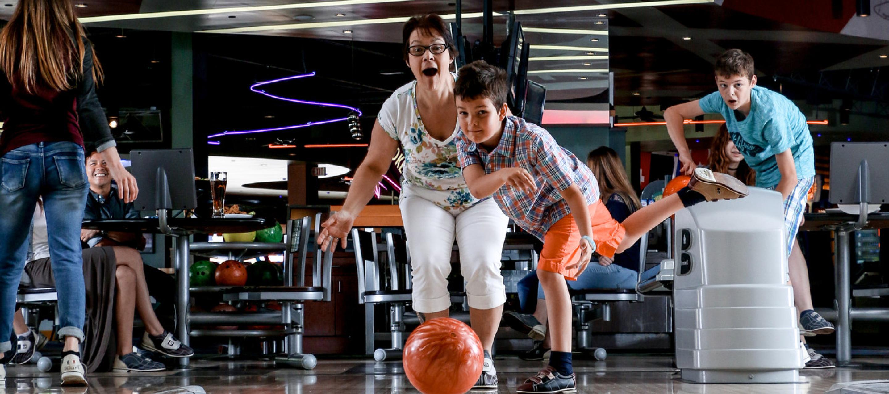 Here you'll find 14 full size 10 pin bowling lanes, a high-def audio/visual system, intelligent LED lane lighting and touch screen monitors for easy, automated scoring. Plus, with special bumper-rails that can be raised or lowered for each player, kids and novice bowlers don't have to throw gutter balls.