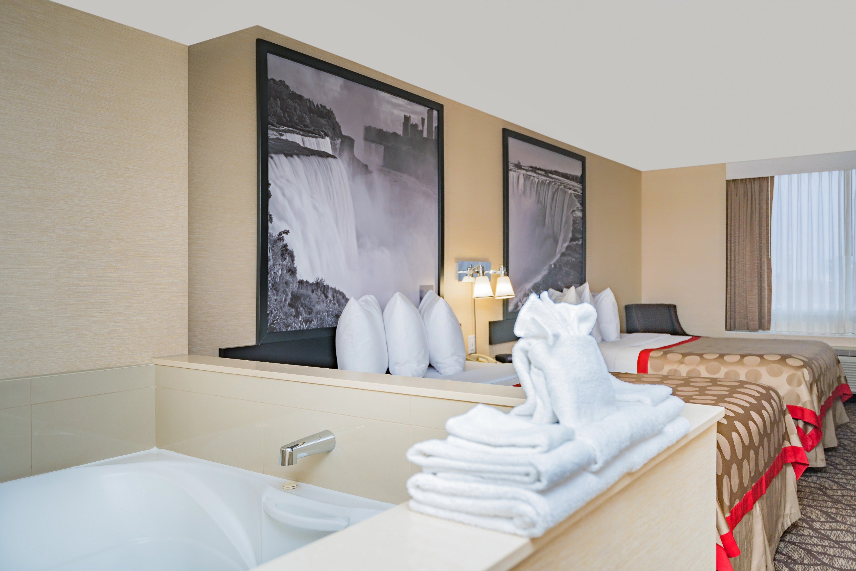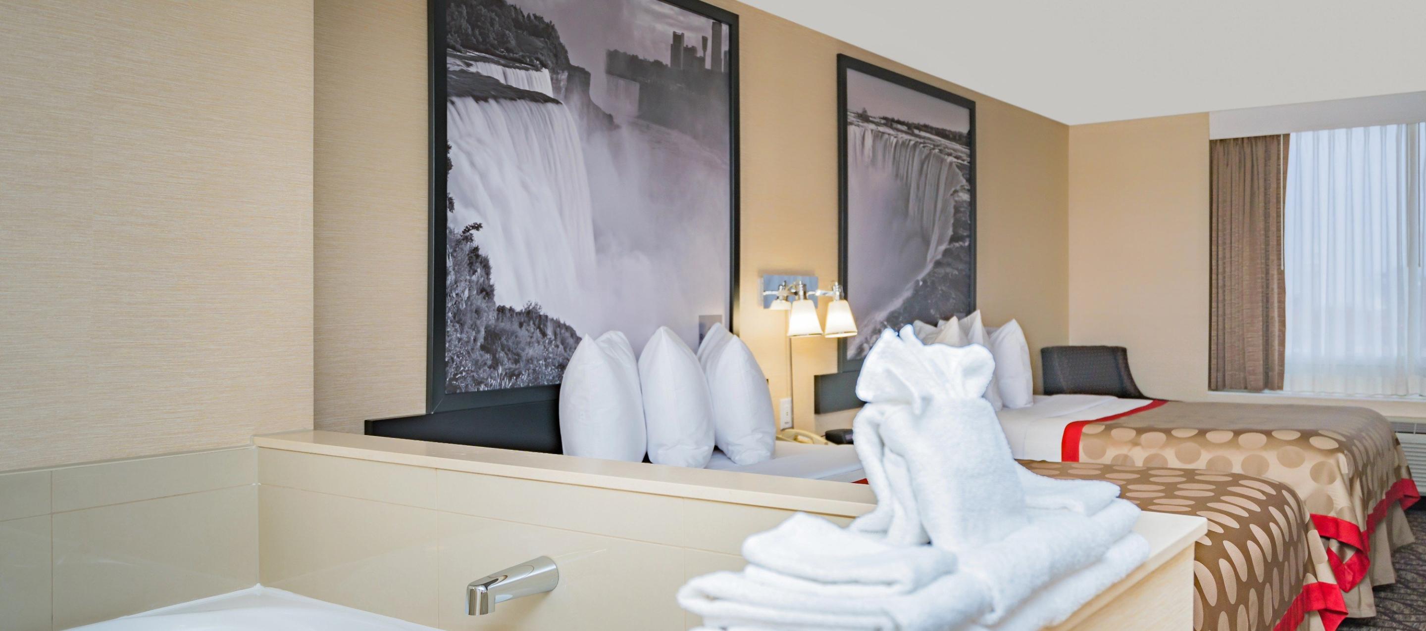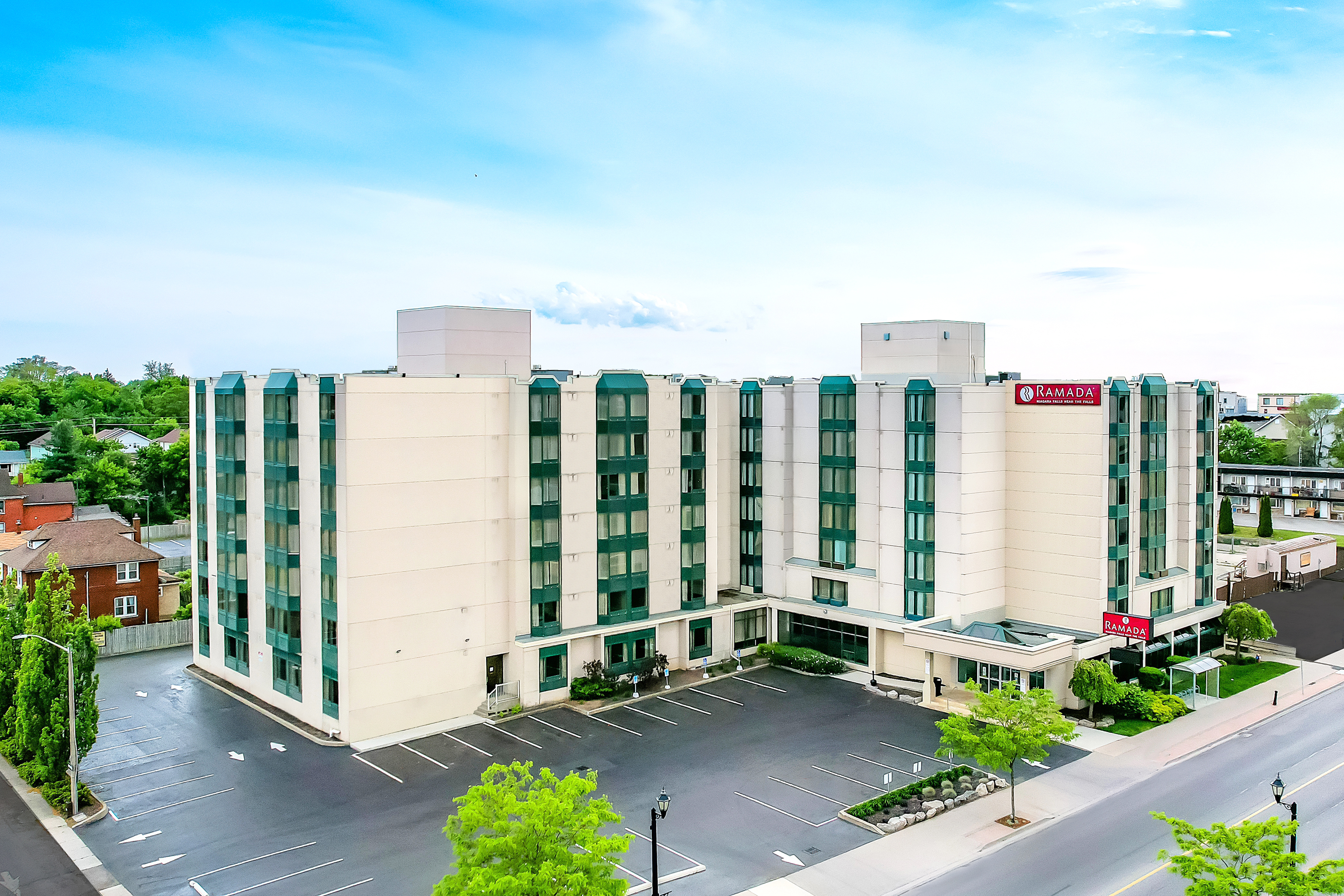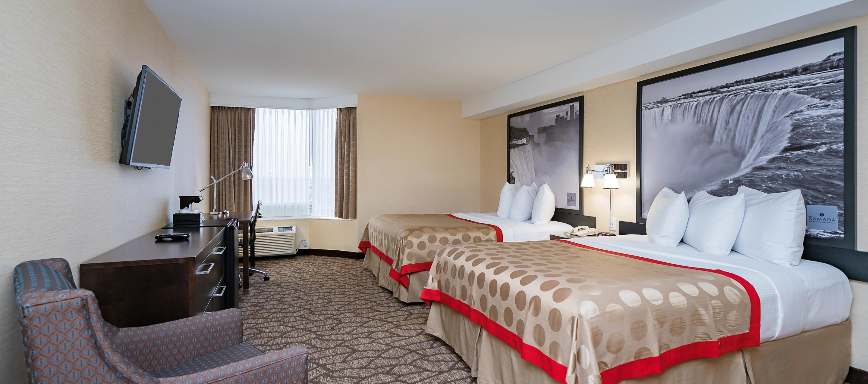 The Ramada by Wyndham Near the Falls Hotel is a 10-minute walk to the Falls and conveniently located near major Niagara Falls attractions, including Journey Behind the Falls, Niagara Boat Tour Cruises, and the Niagara Parks Power Station. The world-famous Clifton Hill district is within a short walk from the hotel. The Fallsview Casino, with 150 gaming tables, 300 slot machines and live entertainment in two venues—the Avalon Theatre (an intimate 1500-seat venue) and their brand new 5000 seat OLG Stage at Fallsview Casino—is walking minutes to the hotel. Skylon Tower and other attractions are also within sight of the hotel. Our hotel amenities include an indoor pool, fitness room, and arcade for all to enjoy.